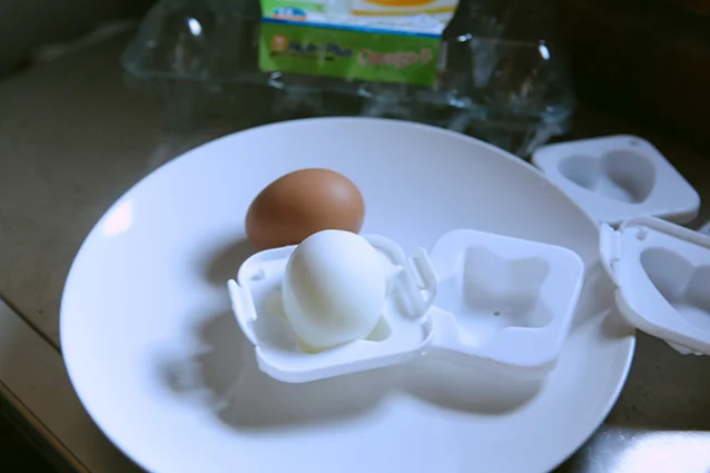 - Peel the hard boiled eggs while they are still hot and place in egg molds;