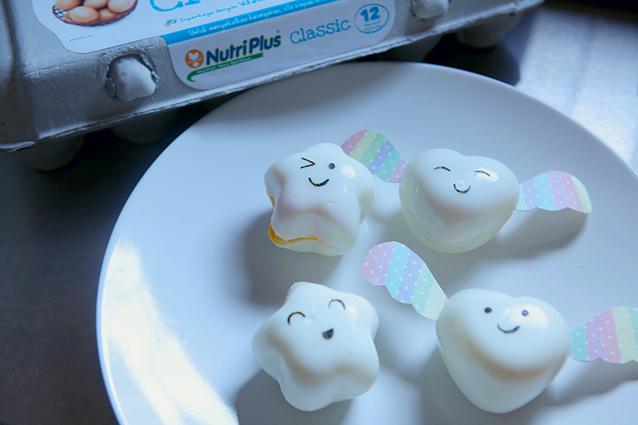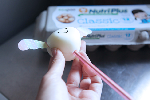 Cut the facial features - eyes andd mouth out of nori sheet and stick onto the eggs;
