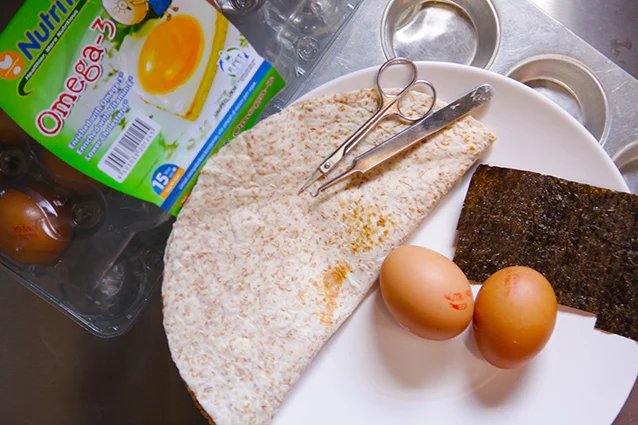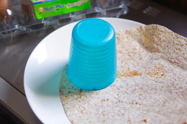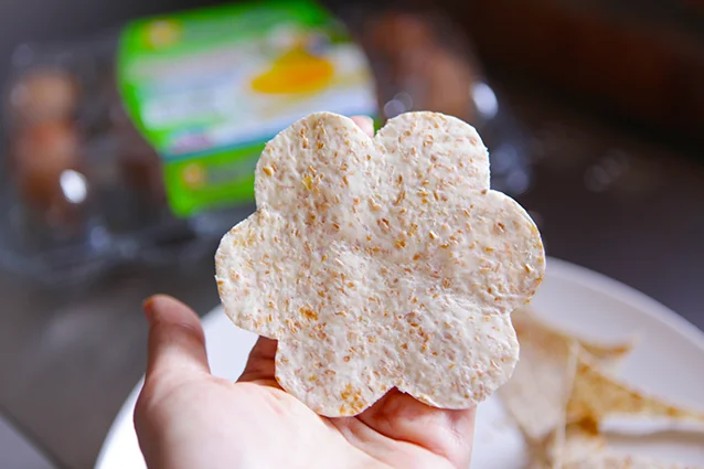 Use a plastic cup (diameter +- 10cm) to cut circles out from tortillas (2 for each egg). Trim the side of circle to make flower petals;