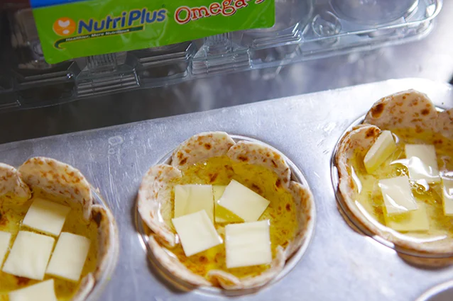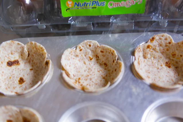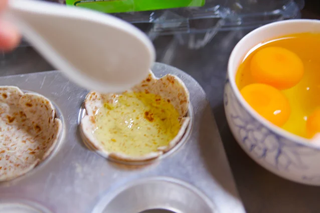Use spoon to scoop egg whites into each tortilla flower holder. Put some cheddar cheese in the egg white;