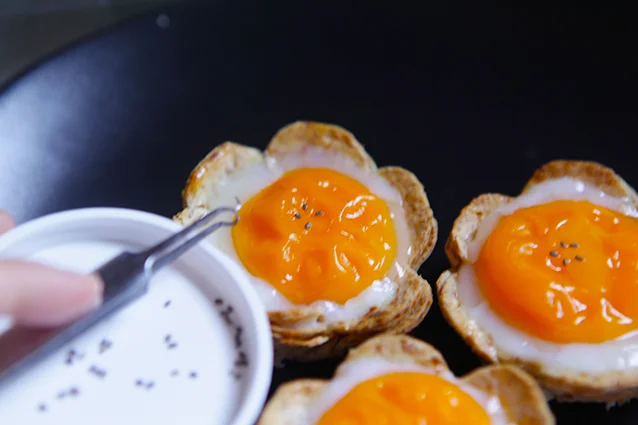 Remove those flowers from oven, carefully place an egg yolk at the centre of each flower. Continue baking for 3 min. or until the yolk is slight cooked but still runny.