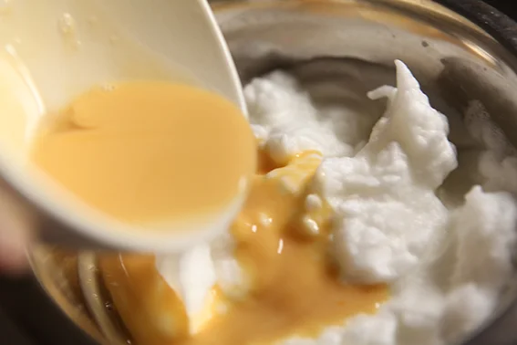 In another mixing bowl, beat egg whites until soft peaks form. Fold in yolk mixture;