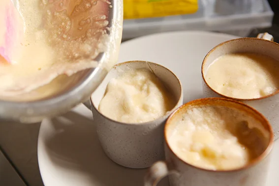 Pour into 4 cups or ramekins. Bake at 200 degree Celcius for 10min. or until puffed up.