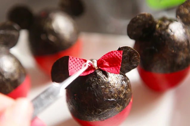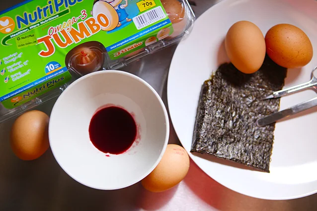 Tips: Make sure the nori sheet is slightly wet so that it can adhere to the egg shell.