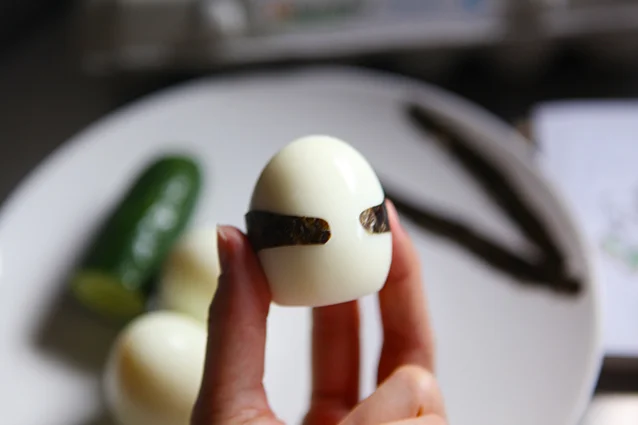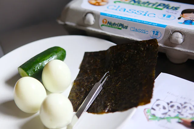 Tip: Nori sheet sticks well on hard boiled egg white while the egg is slightly moist.