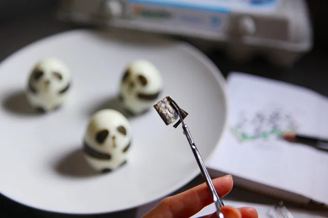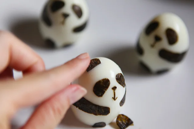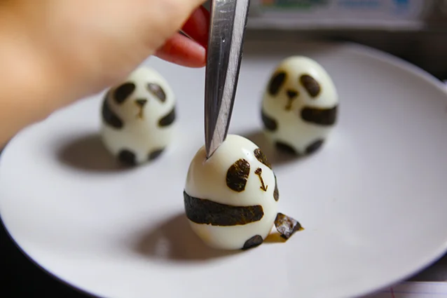 Cut triangles (with rounded corners; 2 for each egg) from nori sheet and stick on hard boiled egg (above the hands);