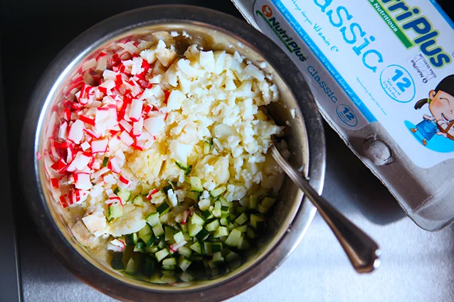 Add in cucumber dices, crabstick dices and salad dressing. Mix well;