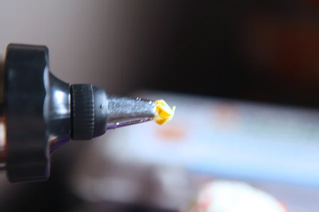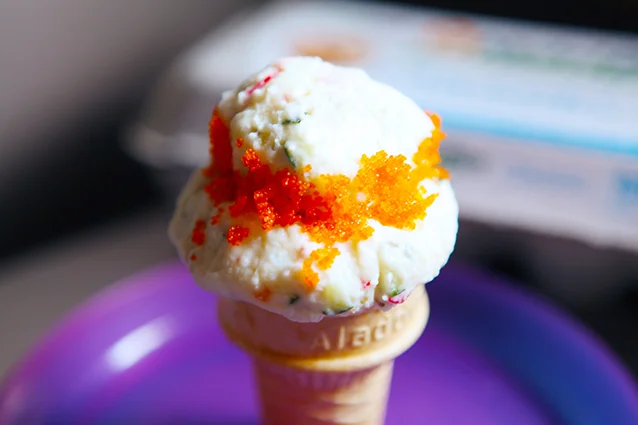 Decorate the potato-eggs-cream with ebiko and pipe the yolk cream on top.
