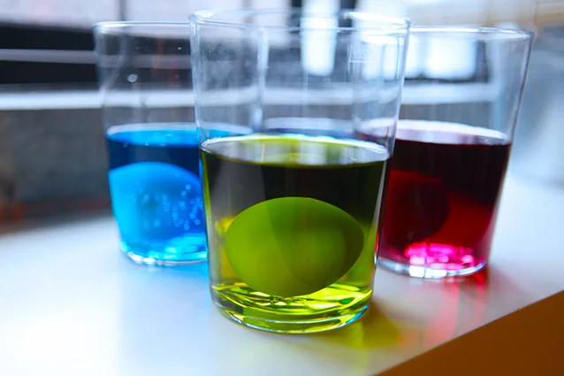 Put a few drops of food colouring (depending on the colour desired) in a cup filled with water. Soak those hard boiled eggs in colouring water for approximately 5-10min. (or until the desired colour is obtained);