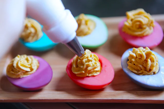 - Use piping bag to pipe (or use spoon to scoop) egg yolk into the hole of each "egg white ship";