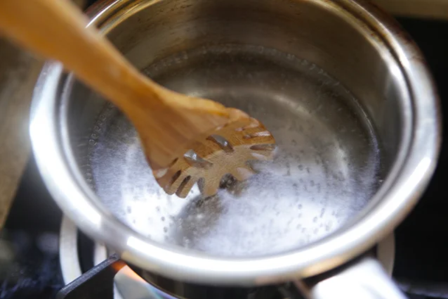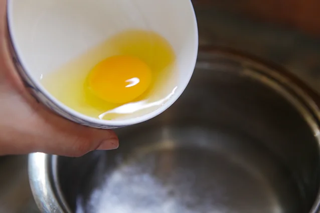 Prepare a pot of water. Add a tablespoon of vinegar into water. Boil the water until it is barely simmering, whirl the water with spoon, then gently slip the egg at the centre of the water whirl;