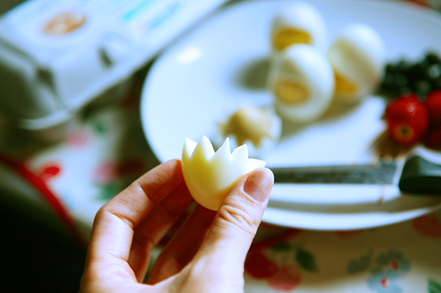 Cut a thin slice of egg white from the other end of the egg so that the egg could stand up.