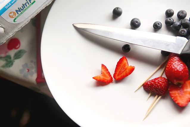 Make a V cut on wide end of strawberry, then cut the strawberry into halves (the halved strawberries look like a heart shape);