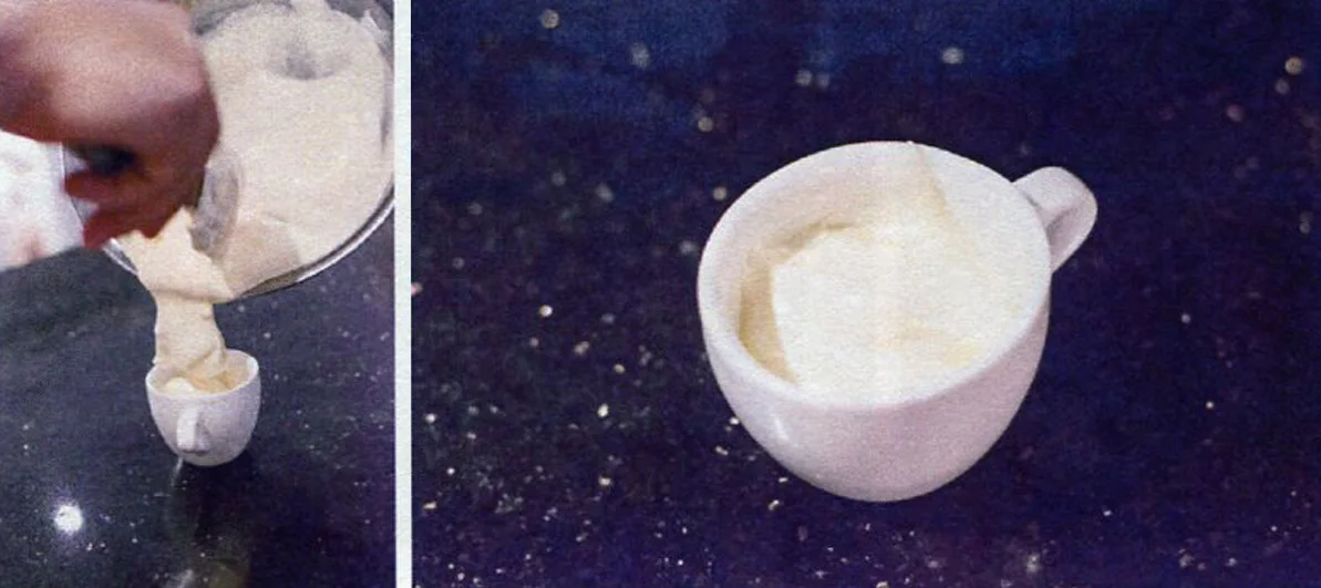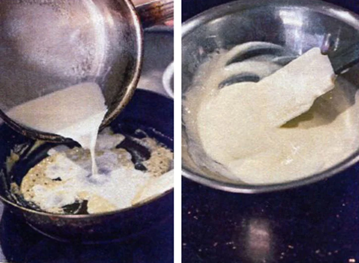 3. Pour the heated milk into cooked flour, mix well and continue to cook until thick cream consistency, leave cool.