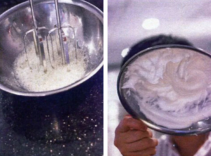 4. Beat egg white until white foam starts to form then add in sugar slowly and beat egg white until stiff peak.