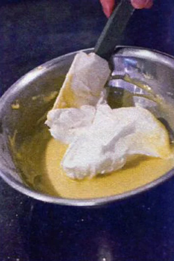 5. Pour 1/3 of egg white into the cooled custard batter and fold well. Then add in the rest of the egg white and fold gently and mix well.